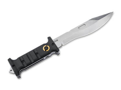 The Boker Plus Extension Knife reimagines a classic hunting design with bold innovation and rugged performance. Featuring a robust D2 steel blade, it transitions seamlessly between two locking positions: a 4.7" blade for precise gutting and skinning, and a 7.3" extended blade for added reach in demanding field situations. This knife provides a marriage of fixed blade and folding knives. A heavy-duty cross bolt secures the blade without tools, ensuring rock-solid reliability in both configurations. Inspired by the medieval Baselard sword, the handle combines textured G10 and steel for exceptional grip, while a striking spike at the base adds tactical versatility. Complete with a custom Kydex sheath, this knife is a standout choice for hunters, collectors, and anyone who values rare functionality in the field.