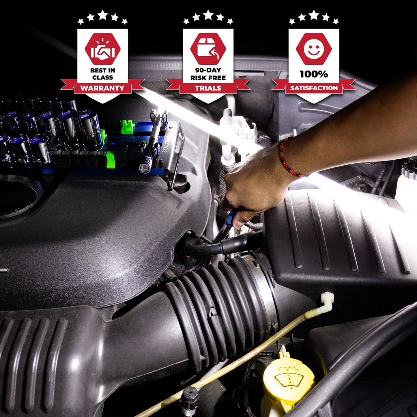 A 44" flexible LED strip lights up tight, hidden areas—perfect for engine bays, inspections, and more.